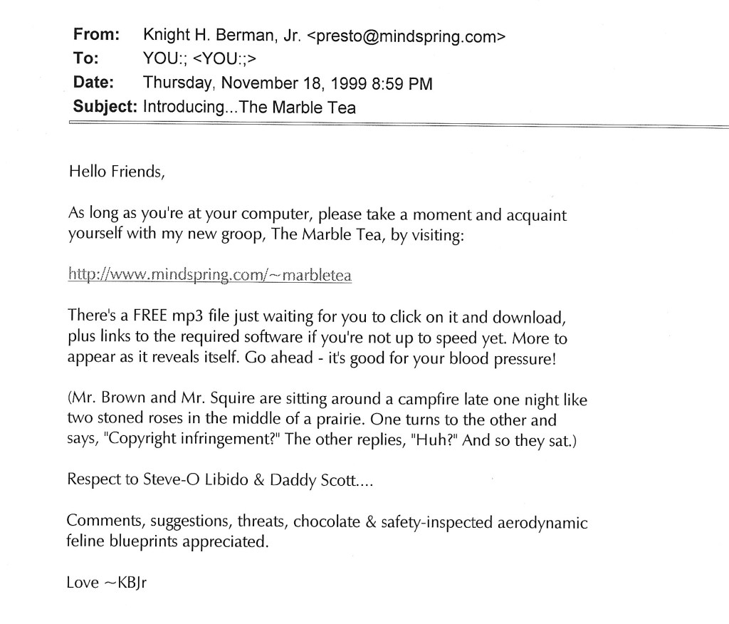 Well, looky here! It was on this very date (and a Thursday too!) in 1999 that I made an official announcement of sorts that I had a new musical project called The Marble Tea. Judging from the quality of the song, it’s easy to see that then, as now, I had no real shame. Here’s the version of The Stone Roses‘ Elephant Stone, and the email I sent out to a small group of friends. Thanks to Kate for finding this amongst all her stuff! (PS: that email address is no longer valid – for me anyway – nor is the web address.)